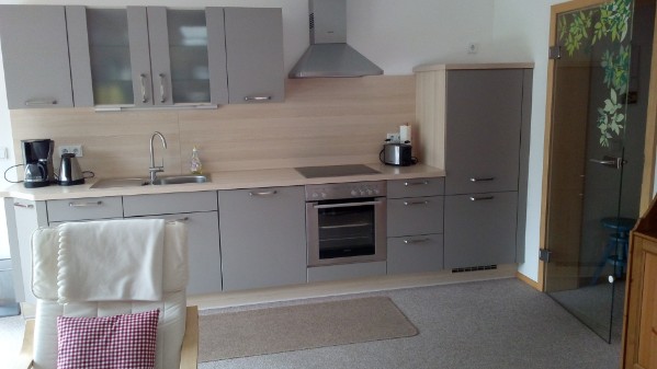 Küchenzeile mit Spülmaschine, Herd, Backofen, Dunstabzug, Kühlschrank, Kaffeemaschine, Wasserkocher, Toaster